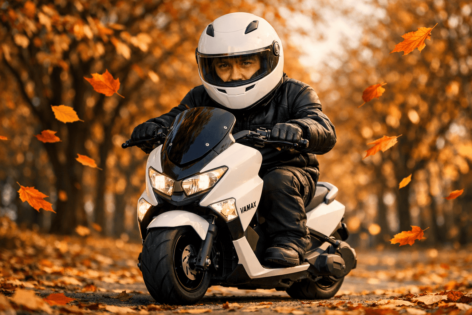 Seorang pria mengenakan helm full-face putih dan jaket balap hitam, mengendarai motor Yamaha Nmax mini berwarna putih di jalan taman yang dipenuhi daun musim gugur. Daun-daun oranye, merah, dan kuning beterbangan di udara, menciptakan suasana autumn yang dramatis. Latar belakang berupa deretan pohon dengan daun gugur berwarna hangat, depth of field lembut dan bokeh sinematik. Sudut pengambilan gambar rendah (low angle), fokus tajam pada pengendara dan motor, pencahayaan natural lembut seperti sore hari. Gaya fotografi ultra-realistis, cinematic, detail tinggi, warna hangat, suasana tenang dan artistik, kualitas foto profesional, 4K, rasio 16:9.