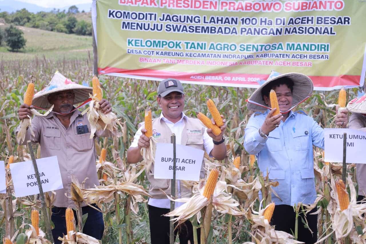 Kota Jantho – Pemerintah Kabupaten Aceh Besar bersama organisasi petani terus memperkuat sektor pertanian melalui program ketahanan pangan. Hal ini ditandai dengan kegiatan panen raya jagung 100 hektar yang digelar di Gampong Cot Kareung, Kecamatan Indrapuri, Rabu (08/04/2026).